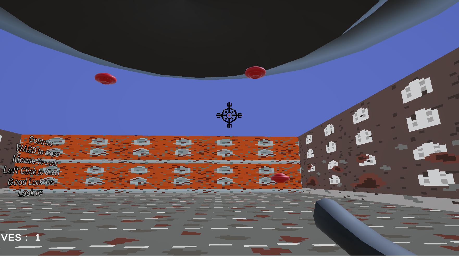 ASWD to move the player, left mouse button to shoot, use the mouse to aim, and try to stop the alien saucers from landing onto the ground. Happy Hunting.
